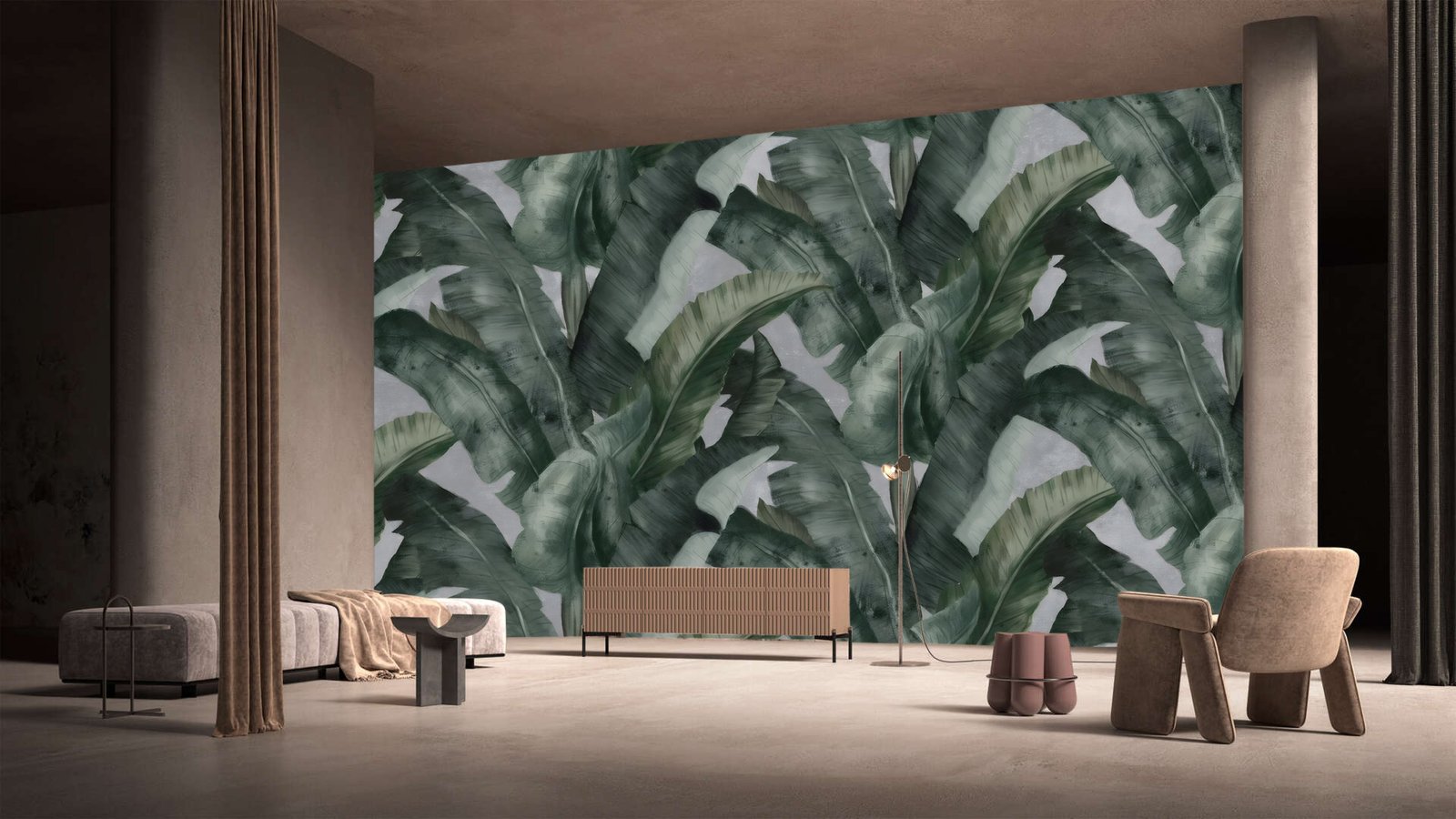 Inspired by the gentle movement of banana foliage, this wallpaper brings depth, calm, and organic elegance into any interior. Rich green tones unfold across the wall like a living canvas, creating a sense of escape while remaining effortlessly sophisticated.