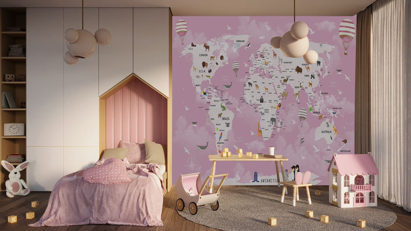 Blush World is a signature kids wallpaper that brings a soft, whimsical charm to any little one’s room. Crafted from high-durability materials, it’s built to withstand everyday play while being incredibly easy to clean and maintain. With its dreamy pink tones, playful animals, and floating balloons, Blush World transforms your child’s space into a cozy, imaginative sanctuary—perfect for learning, exploring, and dreaming big.