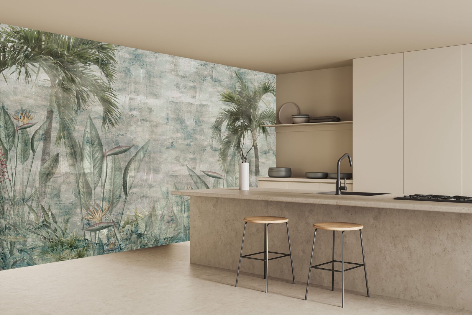 Step into a tranquil escape with Botanic Breeze — a hand-painted wallpaper that brings the quiet elegance of tropical nature indoors. Inspired by the gentle sway of palm leaves and the soft mist of distant jungles, this design turns any wall into a serene botanical canvas.