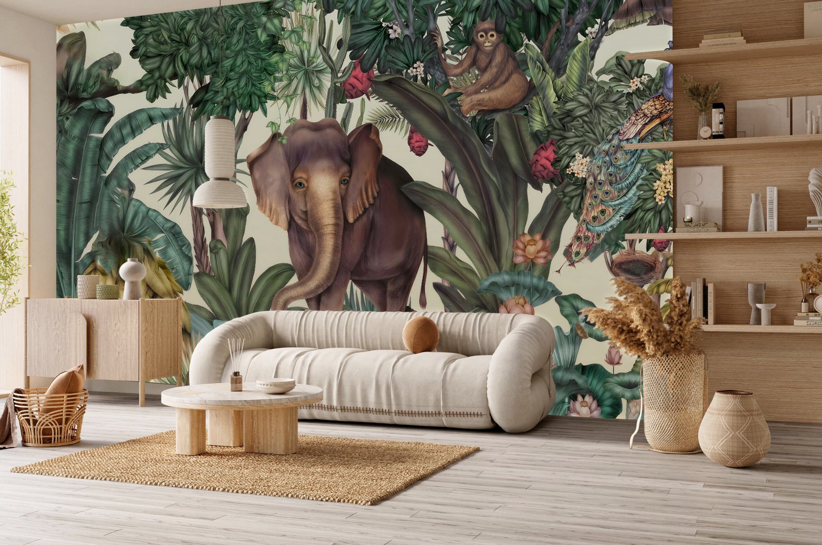 Step into a world where the wild reigns with grace. Botanic Royalty is more than a wallpaper—it’s a storytelling canvas that brings the majesty of the jungle to life. With a regal elephant as its centerpiece, surrounded by lush palms, playful monkeys, and a watchful peacock nestled in vibrant flora, this design transforms any space into an exotic sanctuary.