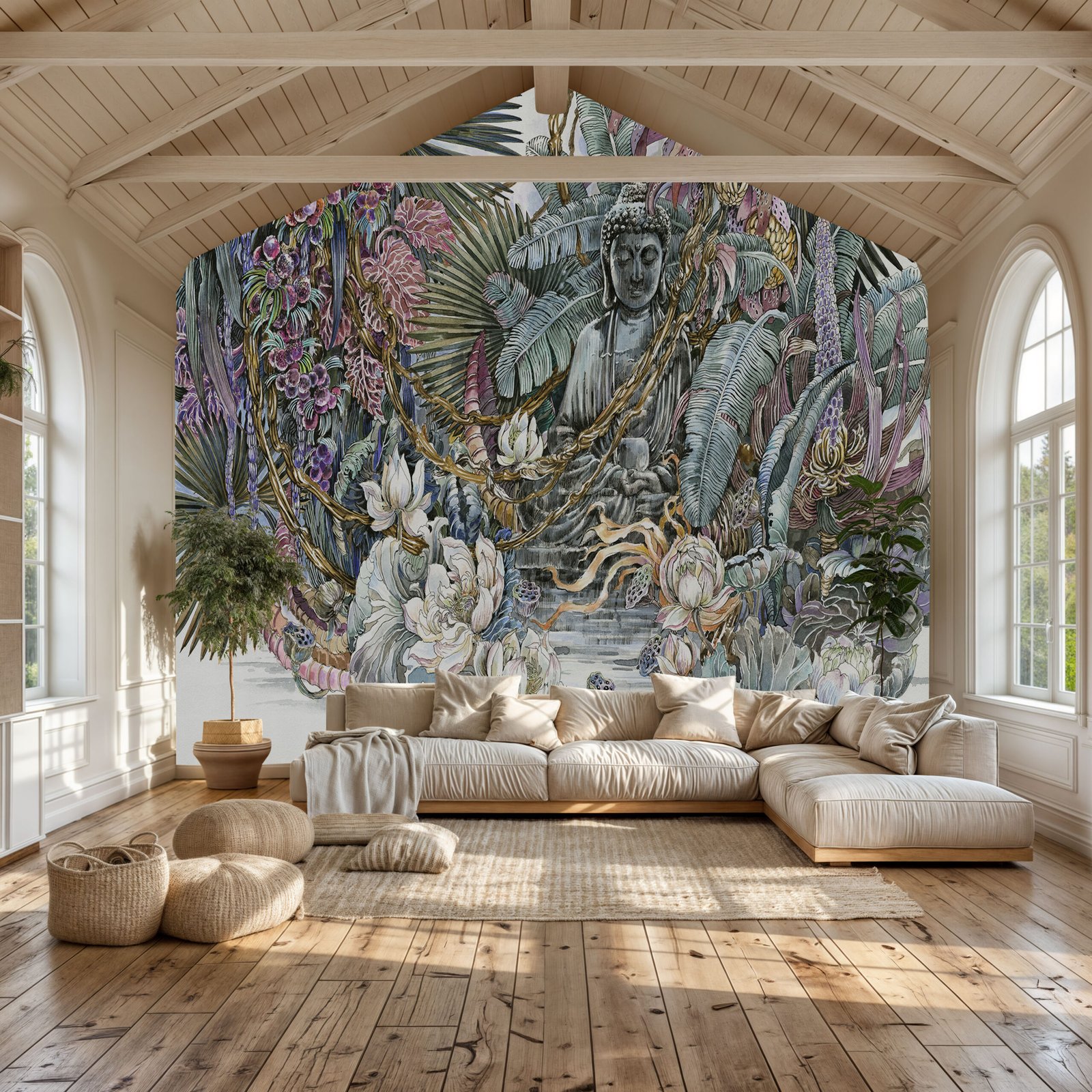 A sanctuary of stillness and soul, Buddha Grove is a hand-painted wallpaper that weaves intricate florals, tropical foliage, and the peaceful presence of Buddha into a lush, meditative masterpiece. Rich in detail and symbolism, it invites harmony, mindfulness, and timeless beauty into any interior.