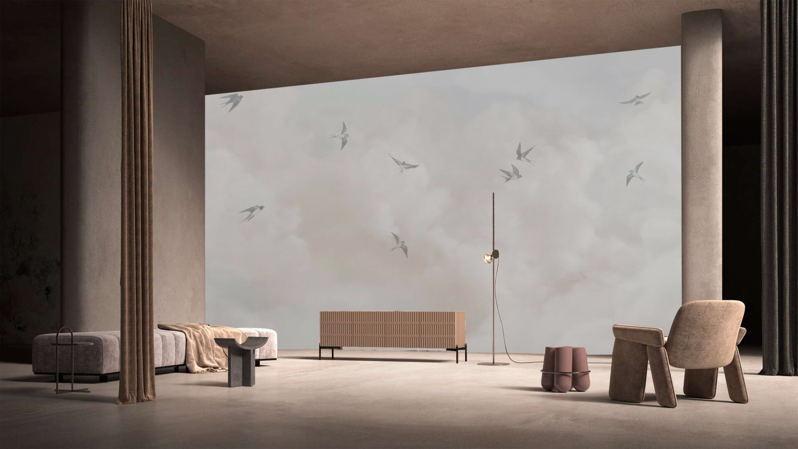 Inspired by the calm of wide horizons and the poetry of flight, this wallpaper transforms walls into an atmosphere of lightness and serenity. Subtle tones and airy forms create a sense of space, allowing interiors to feel open, refined, and effortlessly luxurious.