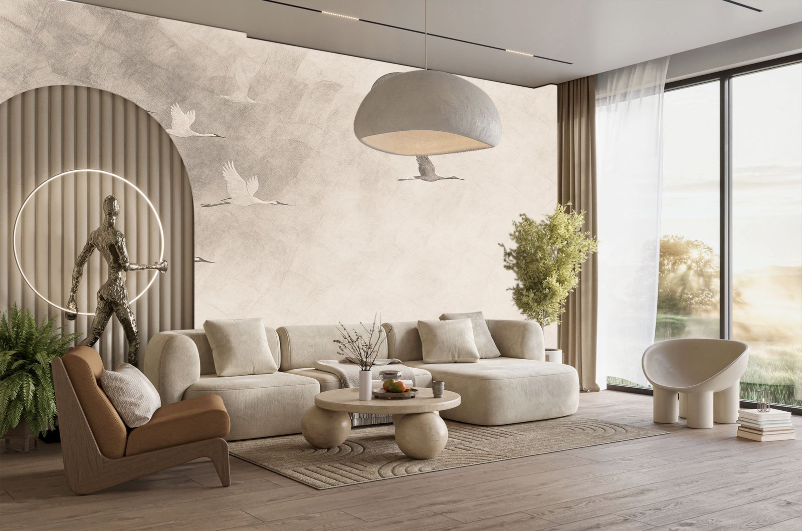 Graceful and weightless, “Crane Soar” is a hand-painted wallpaper that captures the quiet poetry of flight. With delicate lines and soft, neutral tones, cranes glide across a textured sky, embodying freedom, balance, and timeless elegance. Inspired by traditional East Asian art, this design evokes a meditative calm — as if the walls themselves breathe in sync with the wind.