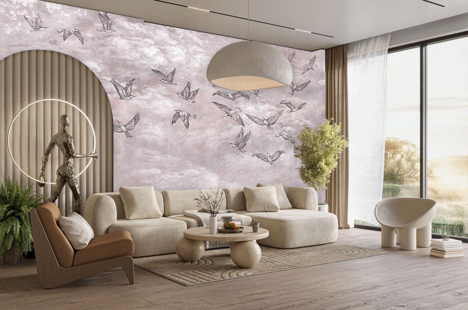 Like poetry in motion, Dancing Birds captures a dreamlike flock in mid-flight, gracefully sweeping across a canvas of soft pastel clouds. This hand-painted wallpaper evokes lightness, freedom, and serenity — a perfect blend of art and atmosphere that brings fluid elegance to any space.