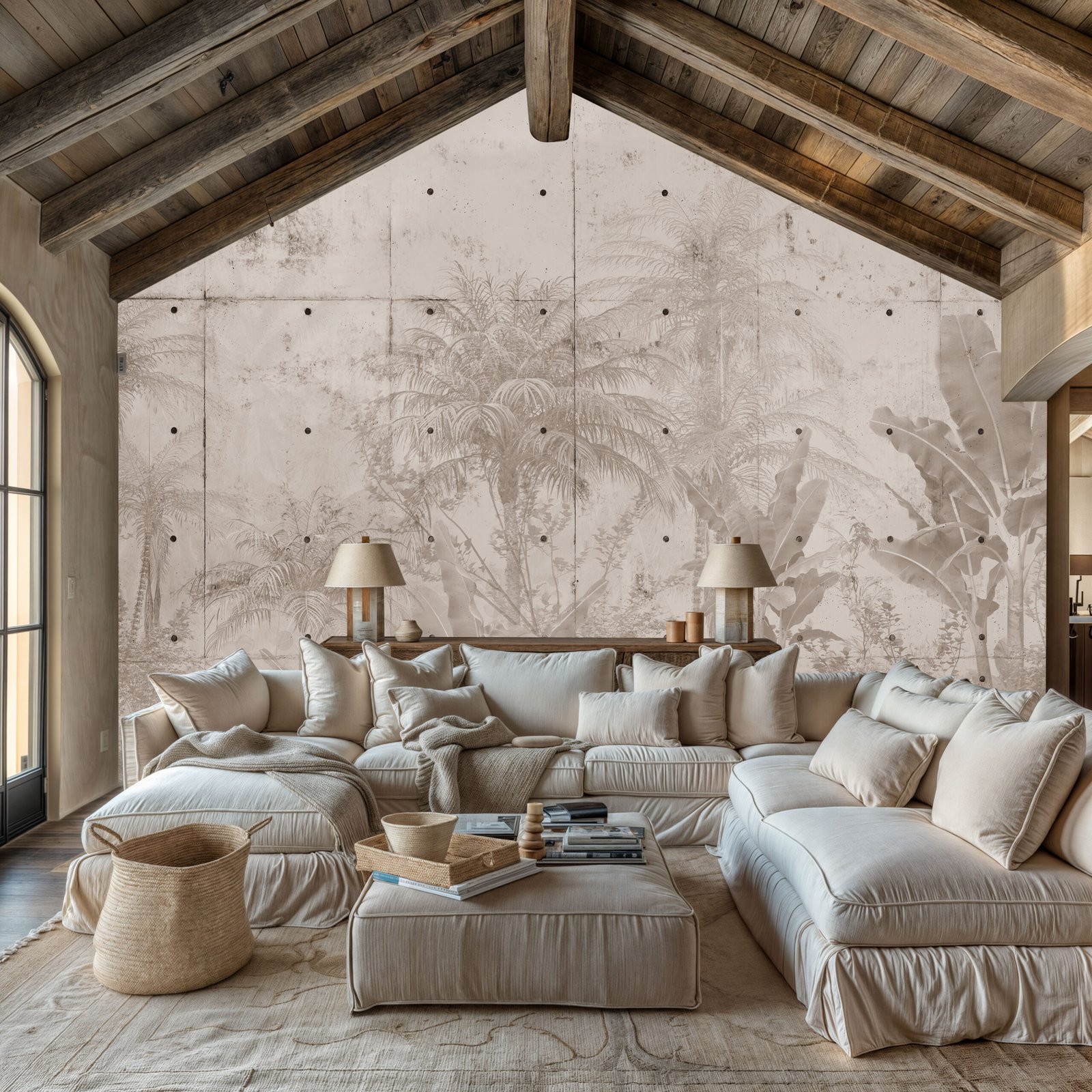 Rooted in warmth and tranquility, Earth Oasis is a hand-painted wallpaper that blends soft tropical foliage with the raw elegance of stone textures. Subtle palm silhouettes emerge through sun-washed neutral tones, creating a grounded, serene escape that feels both natural and sophisticated.