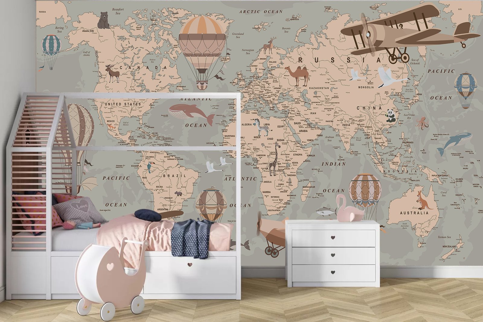 Explorer Map is a signature kids wallpaper that transforms any room into a world of adventure and imagination. Crafted from high-durability materials, it’s made to withstand the daily energy of little explorers while remaining easy to clean and maintain. With its vintage tones, hot air balloons, playful animals, and charming global details, Explorer Map brings warmth, beauty, and a sense of wonder to your child’s space—perfect for inspiring curiosity and creative play.