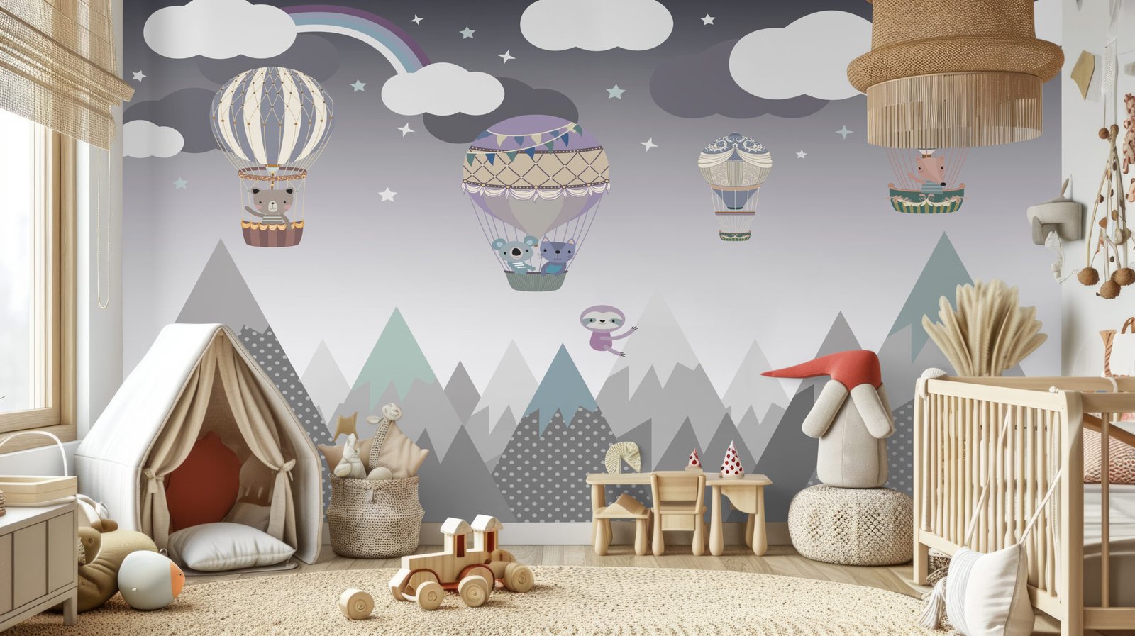 Floating Friends is a signature wallpaper that transforms your child’s space into a dreamy sky adventure. Featuring adorable animals drifting through the clouds in colorful hot air balloons above soft mountain peaks, this playful design inspires imagination and wonder. Made from high-durability, premium materials, Floating Friends is perfect for kids’ rooms—built to handle everyday fun while staying vibrant and beautiful. Easy to clean and long-lasting, it’s the perfect blend of charm and practicality.
