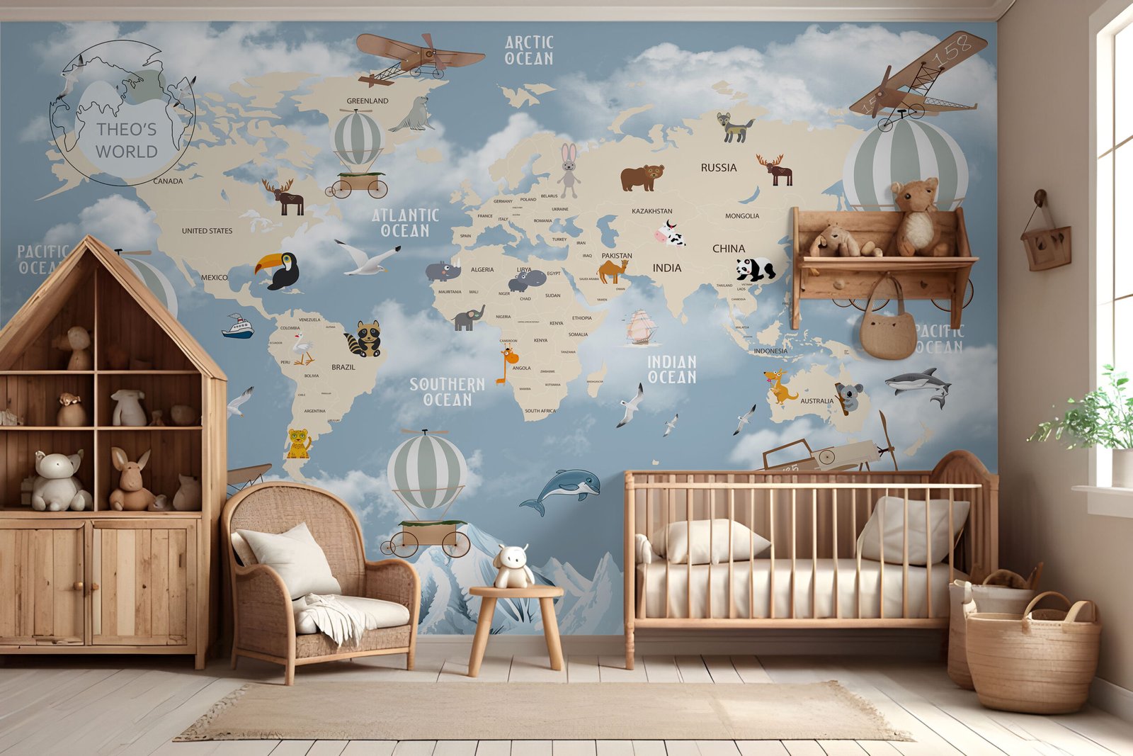 Gentle Globe is a signature kids wallpaper designed to bring calm, curiosity, and character to your child’s room. Made from high-durability materials, it’s perfect for active little explorers and is easy to clean and maintain. With its soft colors, adorable animals, and dreamy sky elements, Gentle Globe adds both beauty and inspiration to any space. As you can see in the top left corner, this wallpaper can be customized with your child’s name—creating a truly personal and heartwarming touch in their world of wonder.