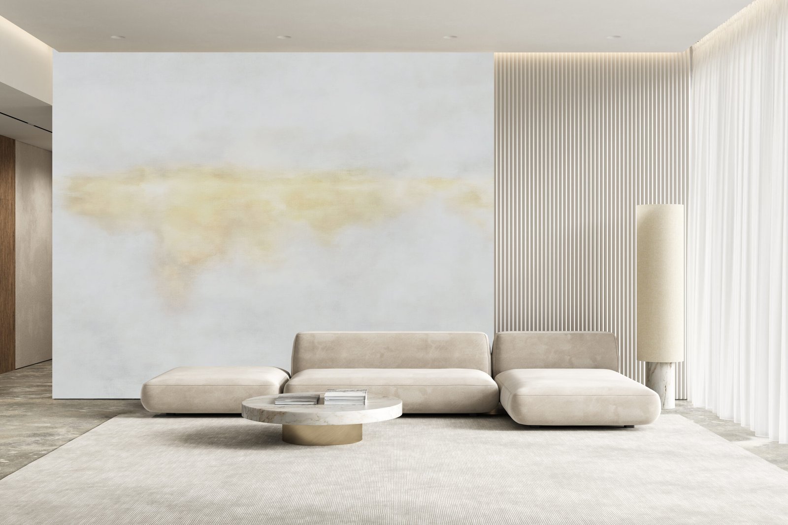 Golden Haze is a quiet moment captured in light — where soft clouds of amber drift gently across a pale, luminous sky. This ethereal design brings a warm glow to any interior, creating a feeling of calm sophistication and effortless elegance. Like sunlight diffused through morning mist, it softens the space while adding depth and character.