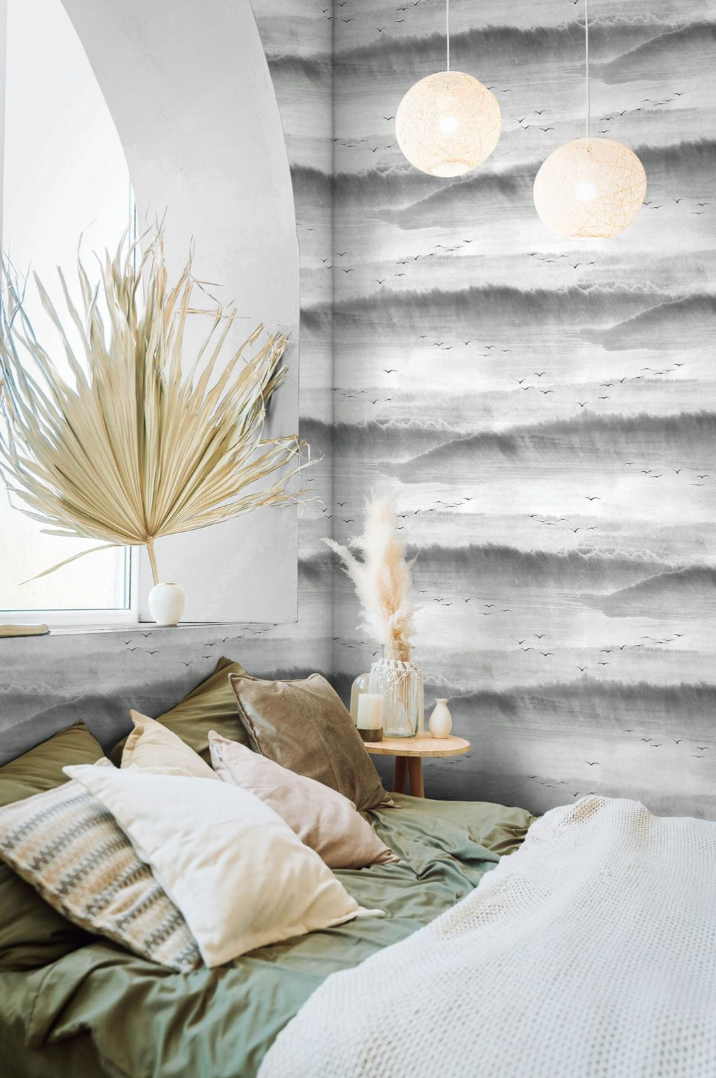 Inspired by quiet mornings and drifting skies, Grey Mist brings a sense of calm and timeless beauty to any space. Its soft gradients and subtle textures echo the peaceful movement of mist over open water, while delicate silhouettes of birds add a poetic, airy touch.