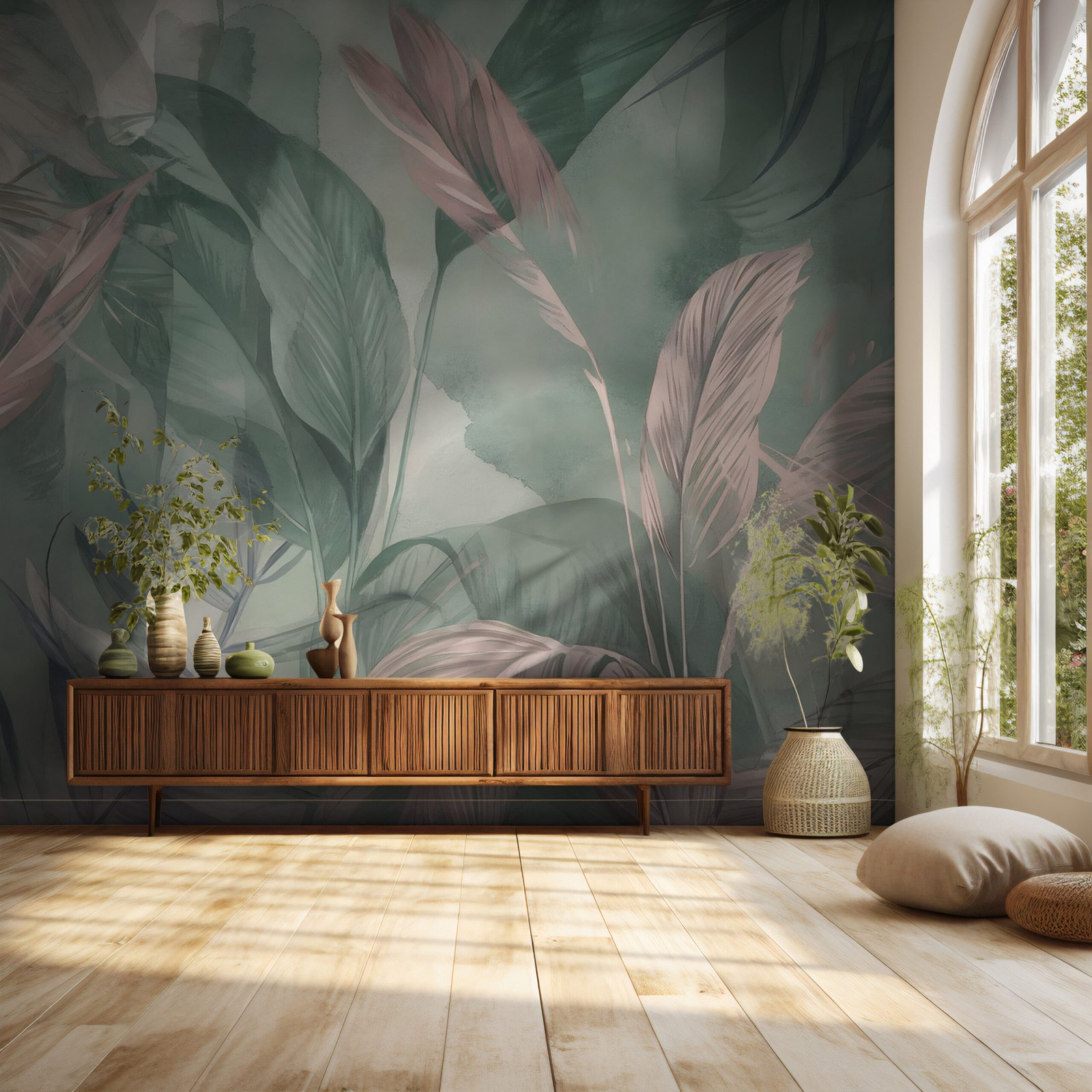 Jade Whisper is a visual symphony of soft botanicals and muted elegance — where delicate blush leaves drift through layers of deep green, like nature’s quiet breath captured on your walls. Inspired by the serenity of tropical gardens at dusk, this design brings a refined sense of calm and organic luxury to any interior.