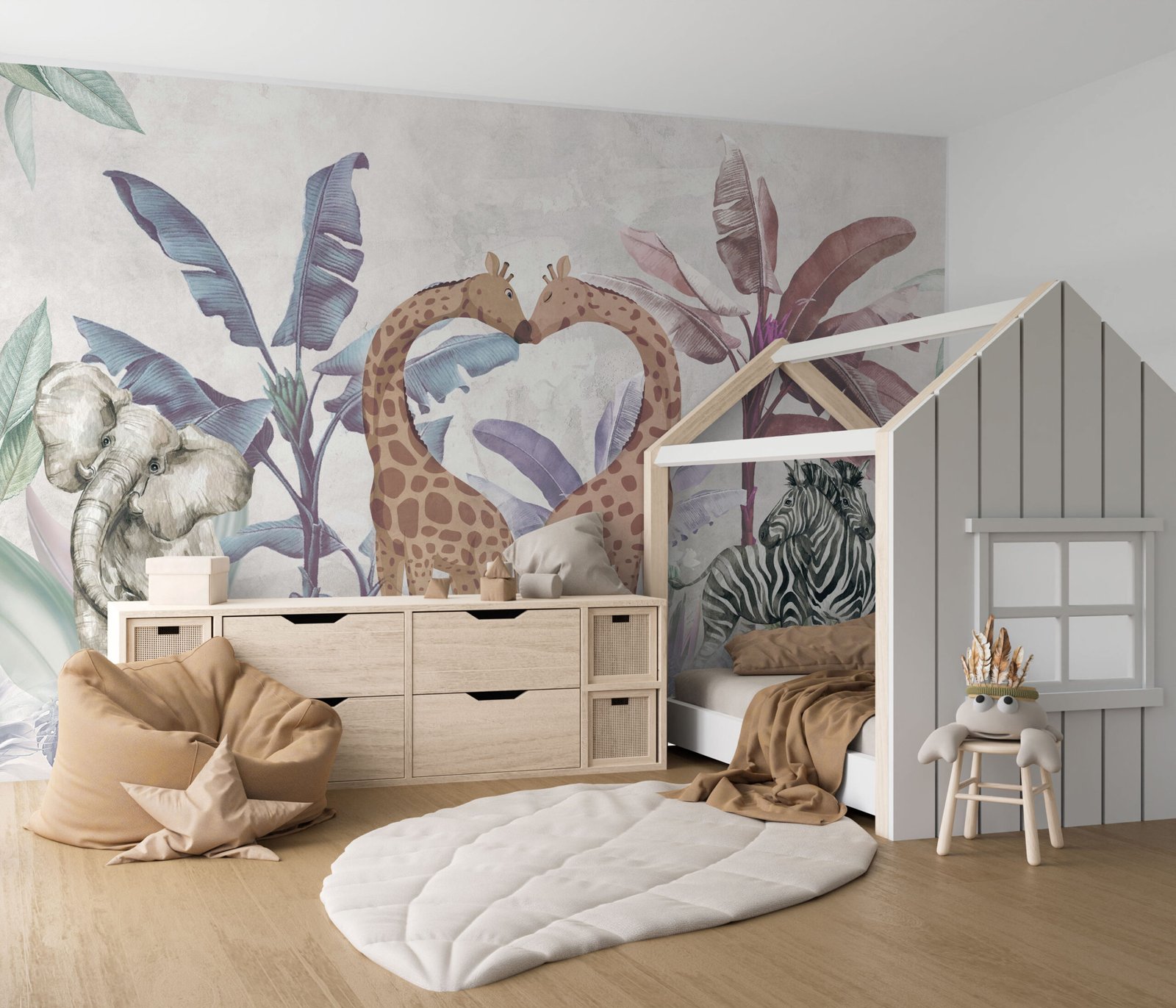 Jungle Love is a heartwarming signature wallpaper featuring affectionate jungle animals surrounded by soft tropical leaves—highlighted by a pair of giraffes forming a sweet heart. Designed with both beauty and durability in mind, this wallpaper is made from high-quality, child-safe materials that are easy to clean and built to last. Perfect for nurseries, playrooms, or bedrooms, Jungle Love brings a gentle safari charm to your little one’s space while sparking warmth, imagination, and adventure.