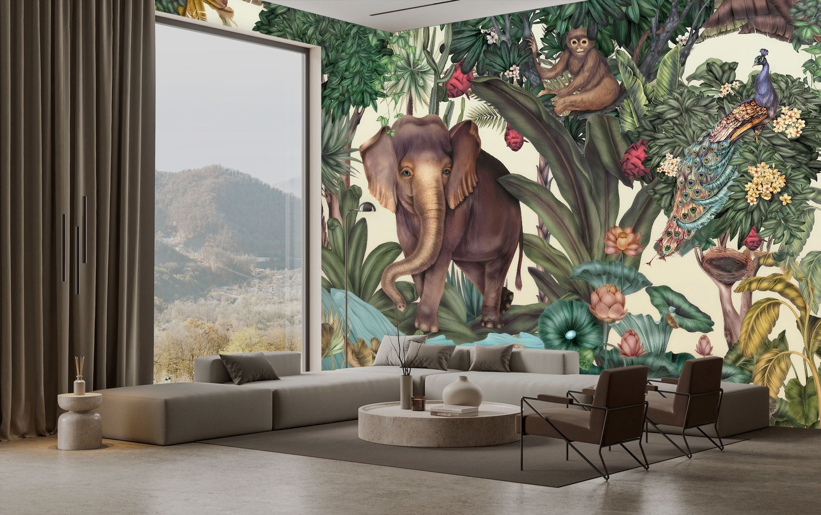 Step into a whimsical jungle where an elephant gently strolls beneath lush canopies, a curious monkey peers from the trees, and a regal peacock watches over blooming lotus flowers. This hand-painted wallpaper transforms any space into a storybook scene, blending artful detail with timeless charm. Crafted using high-durability materials, it’s designed to bring enchantment not only to cozy residential interiors but also to vibrant commercial spaces. With its luxurious finish and robust construction, this mural is as practical as it is poetic — made to last, made to inspire.