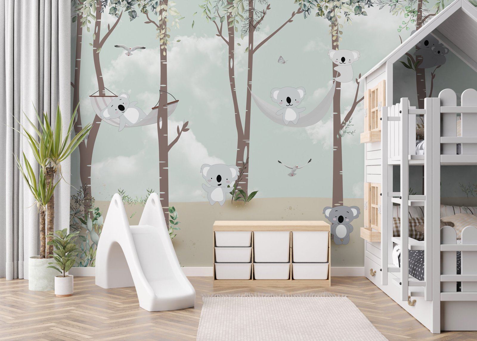 Koala Dreams is a signature wallpaper that brings the calm and charm of the Australian bush right into your child’s room. Featuring adorable koalas lounging in hammocks, climbing trees, and playing among the leaves, this design creates a peaceful and playful setting for rest and imagination. Made from high-durability, premium materials, Koala Dreams is built to withstand the energy of little adventurers—perfect for nurseries, playrooms, or bedrooms. Easy to clean and crafted to last, it’s where cozy meets quality.