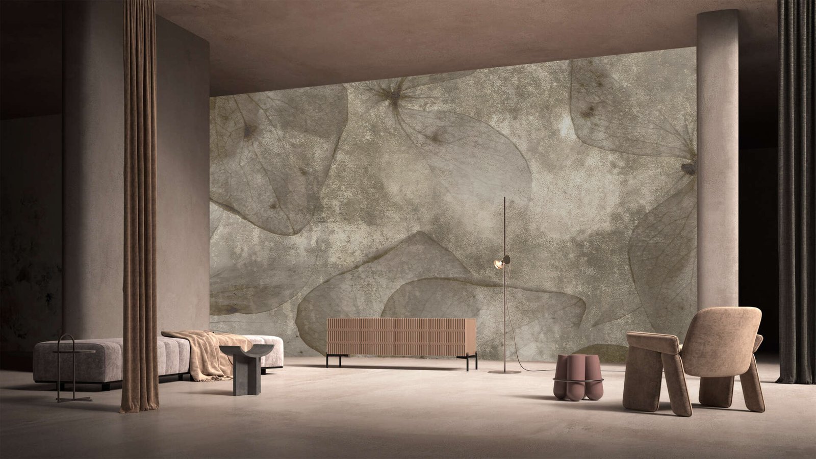 Linen Leaves tells a story of nature softened by time. Delicate leaf forms drift across the wall like pressed botanicals resting on fine fabric, creating a calm, tactile landscape that feels both organic and refined. The muted tones and translucent layers evoke quiet elegance, inviting a sense of balance and understated luxury into the space.