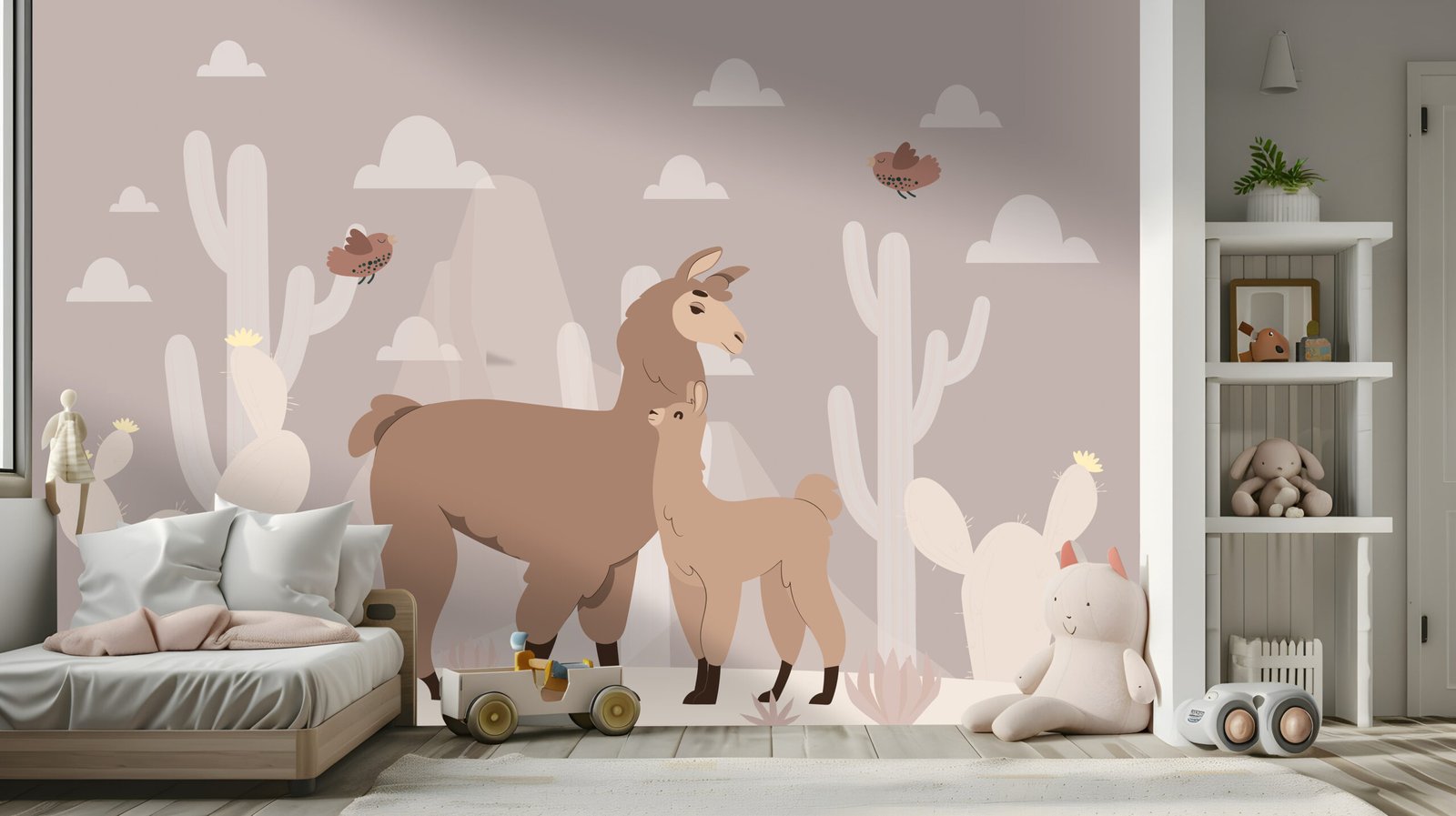 Llama Love is a charming kids’ signature wallpaper that brings warmth and serenity to any child’s room. Featuring a sweet llama duo set in a soft desert landscape with gentle cacti and fluttering birds, it creates a calming, cozy atmosphere perfect for rest and play. Crafted from high-durability materials, Llama Love is built to last and easy to maintain—resisting everyday smudges and stains with ease. Its delicate design adds a touch of natural beauty and tenderness, turning your child’s space into a peaceful little haven filled with love and imagination.