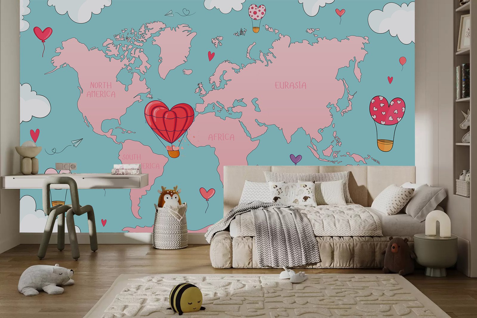 Love Voyage is a signature kids wallpaper that brings a sense of warmth, joy, and imagination to any room. Made from high-quality, durable materials, it’s designed to withstand everyday wear while remaining easy to clean and maintain. With its charming heart balloons and dreamy world map, Love Voyage creates a playful yet soothing atmosphere—turning your child’s space into a beautiful haven of love and adventure.