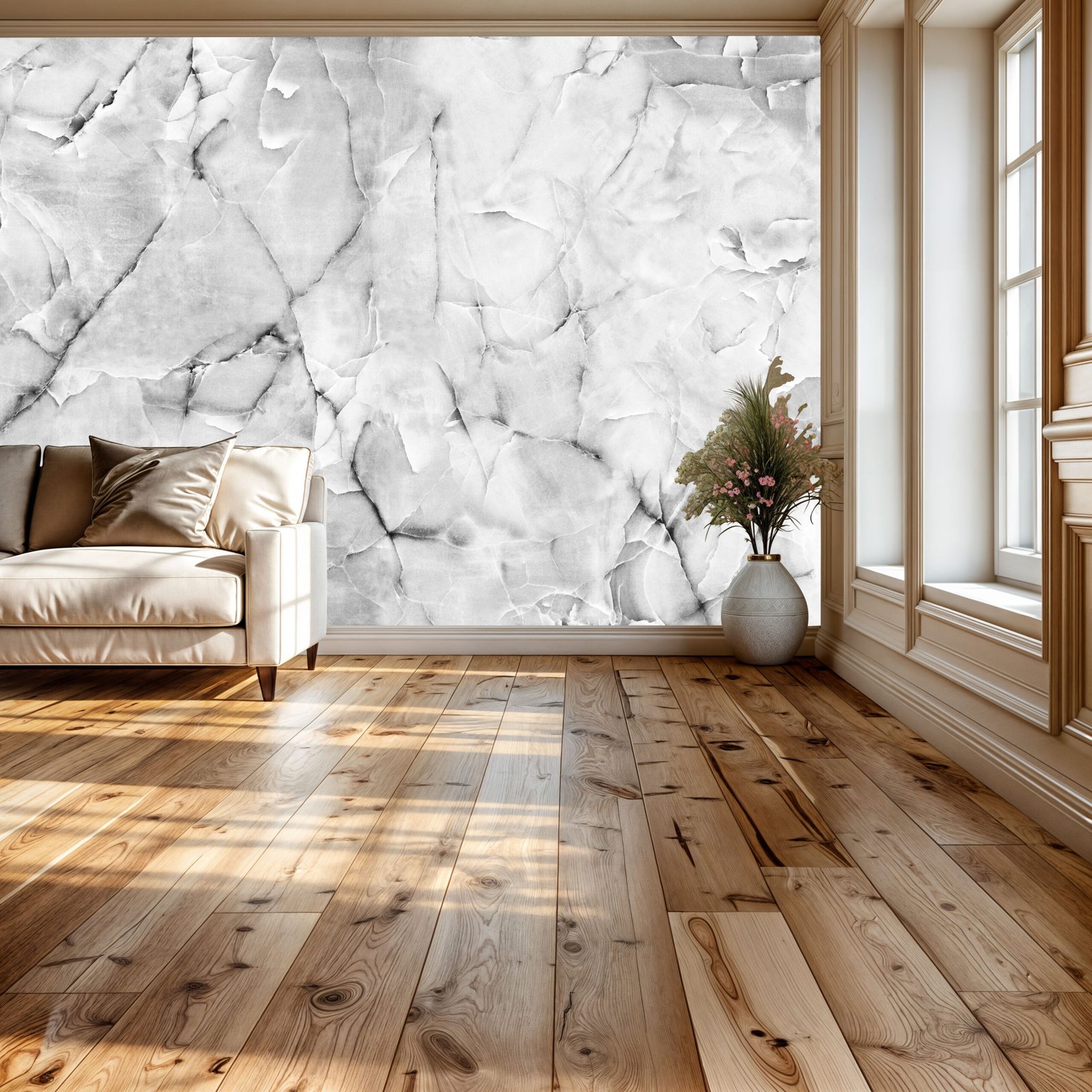 Marble Whisper tells a quiet story of nature’s elegance—its soft veining and fluid textures hand-painted to mimic the silent strength of stone. Crafted from high-durability materials, this design is built to withstand both the demands of busy commercial spaces and the intimacy of residential interiors. Its tranquil tone brings depth and sophistication to any wall, making it a timeless backdrop for refined living.