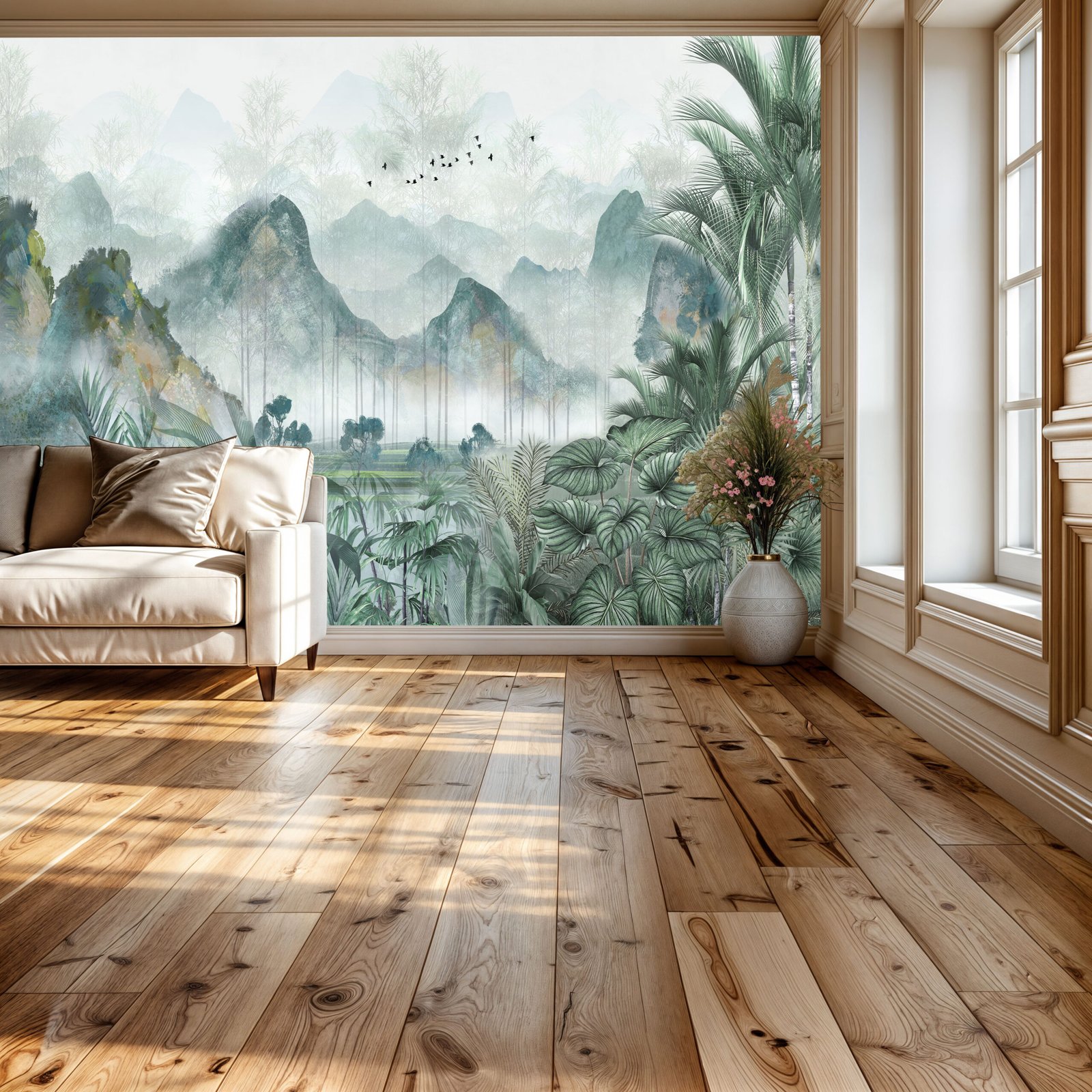A tranquil retreat captured in brushstrokes, Misty Grove is a hand-painted wallpaper that blends lush greenery, soft mountain silhouettes, and delicate morning mist into a serene landscape. Birds soar through layered foliage, and distant trees dissolve into fog, creating a peaceful, immersive escape that brings the beauty of nature indoors.