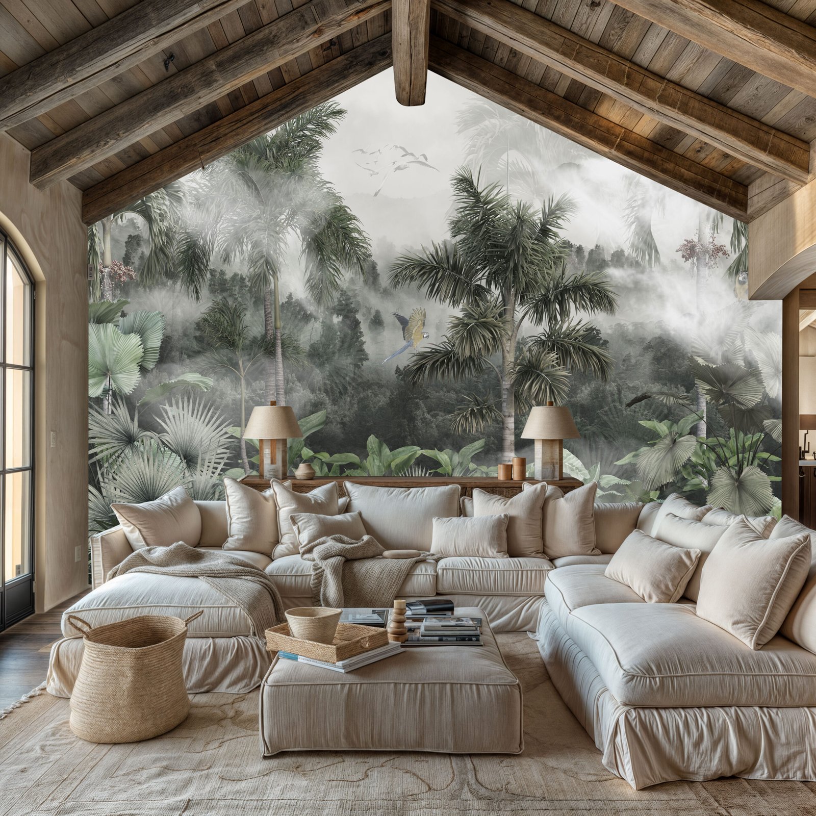 Step into the heart of a dreamlike jungle with Misty Tropics — a hand-painted wallpaper that envelops your space in layers of lush greenery, soft palms, and drifting tropical mist. With gentle parrots in flight and distant hills fading into the clouds, this design brings a sense of calm adventure and untouched beauty to any room.