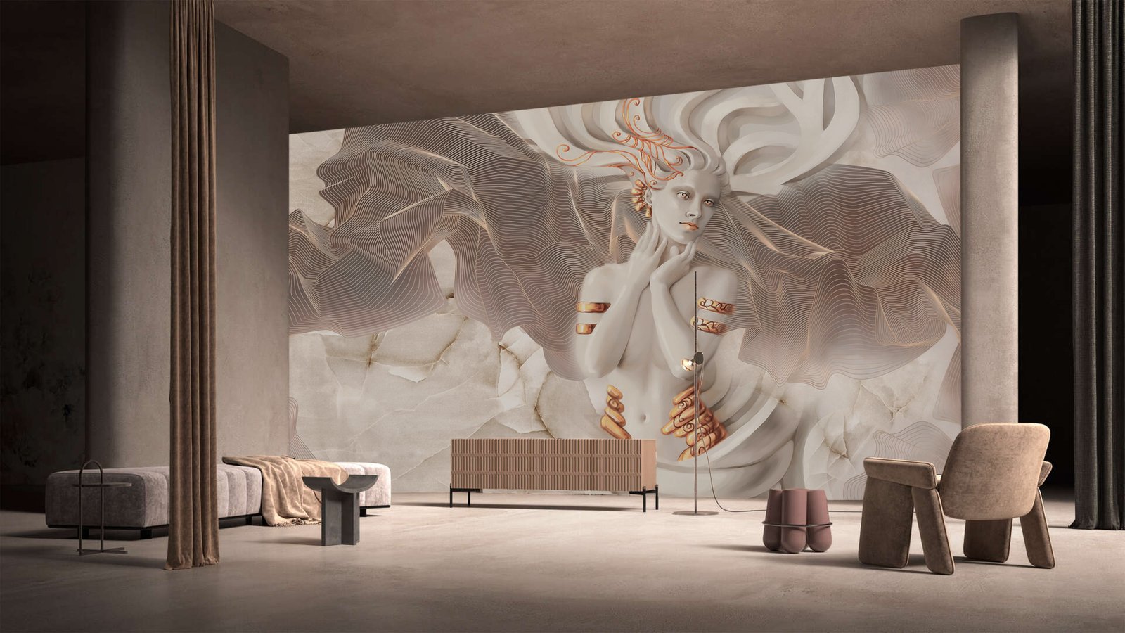 Inspired by classical sculpture and contemporary artistry, this wallpaper transforms interiors into a statement of elegance and grace. Gentle contours and luminous details create depth and movement, turning the wall into a captivating work of art that feels both timeless and modern.