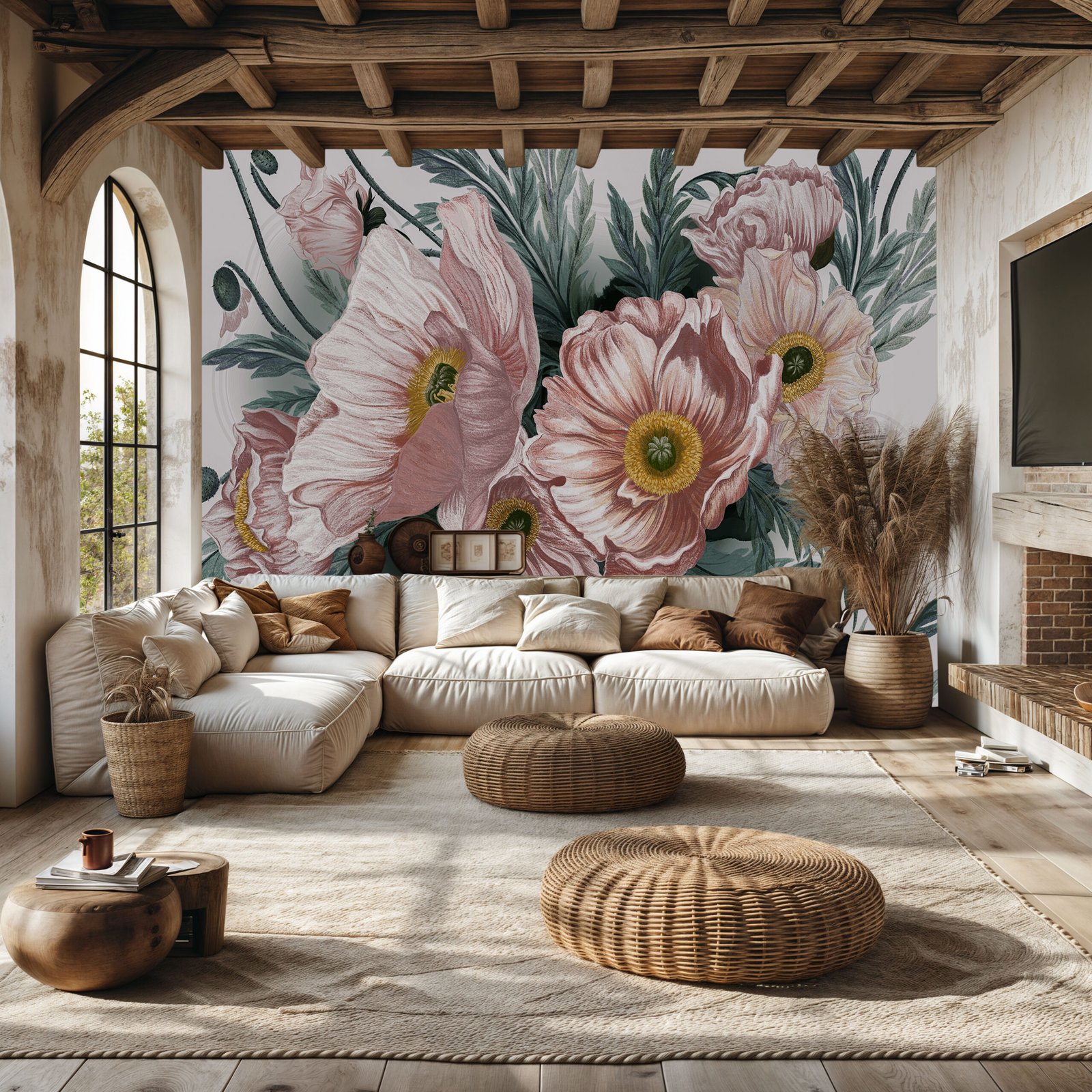 Delicate, dreamy, and timeless — Pastel Petals brings a painterly romance to your space with hand-painted florals in soft blush and muted green. Inspired by vintage botanical art, this design blossoms with quiet charm, turning walls into a canvas of elegance and serenity.