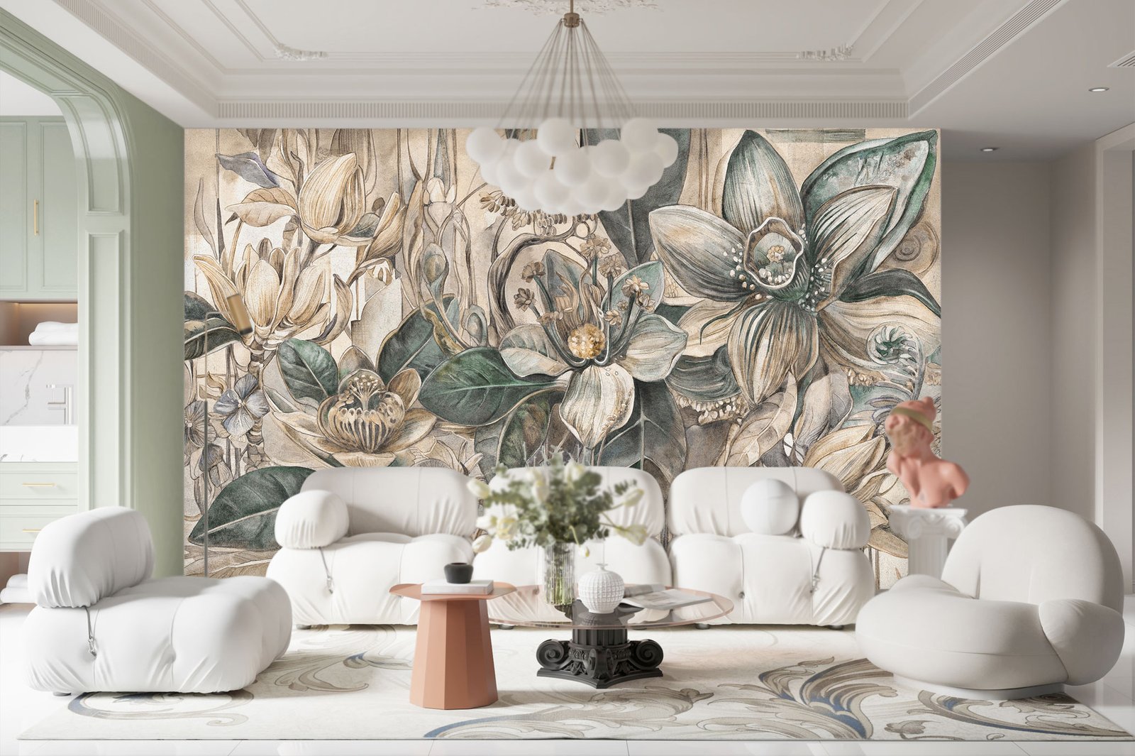 Crafted from high-durability materials, Petal Symphony is made to grace both residential sanctuaries and commercial interiors. Whether enhancing a refined living room, boutique hotel, or elegant café, this wallpaper offers the perfect union of beauty and resilience — turning every wall into a living composition that sings with style and sophistication.