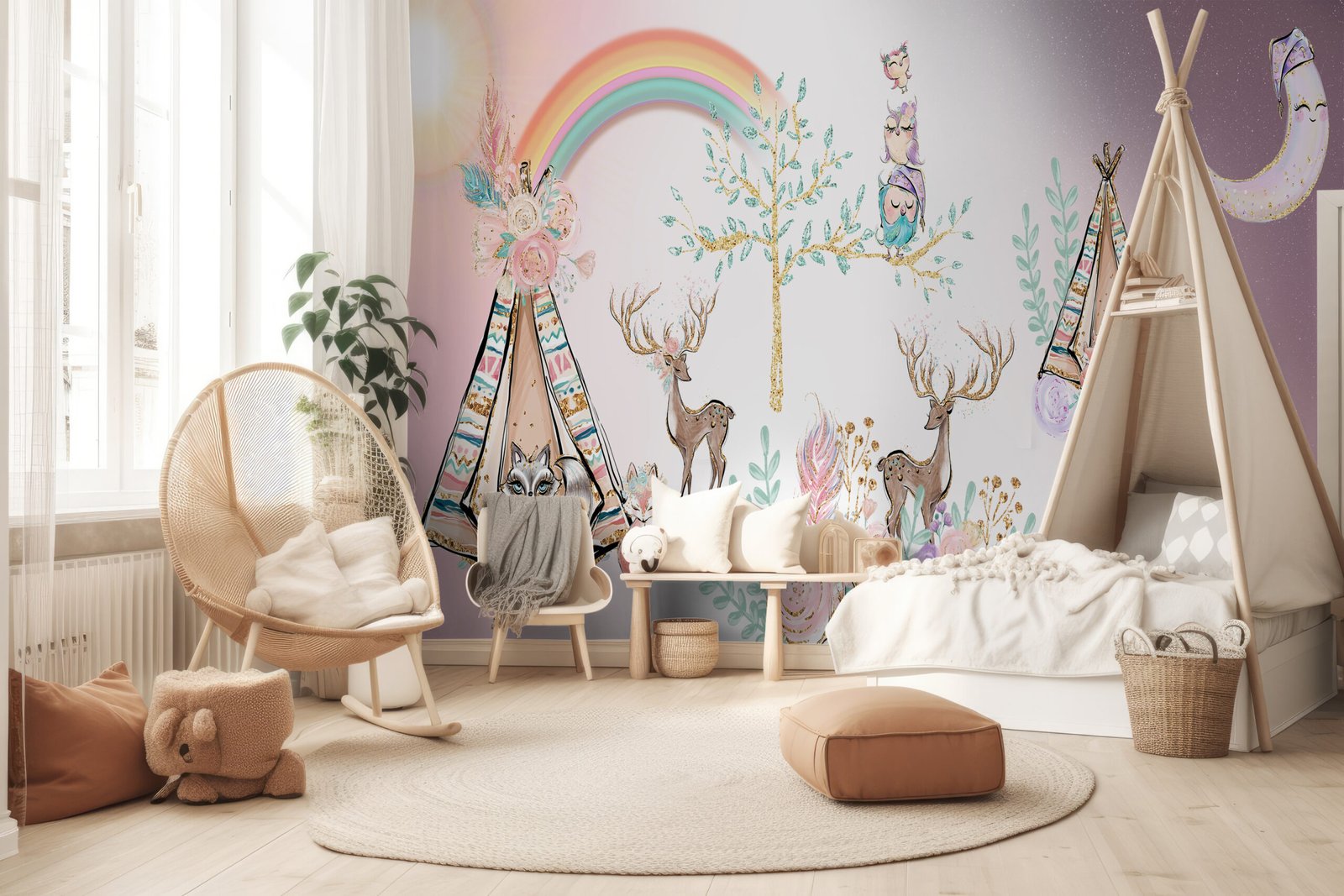 Rainbow Camp is a signature kids’ wallpaper that brings a whimsical world of color, nature, and imagination into your child’s room. Featuring pastel rainbows, playful teepees, gentle deer, and dreamy forest creatures, it creates a cozy, storybook-like atmosphere perfect for both rest and adventure. Crafted from high-durability materials, Rainbow Camp is designed to stand up to the daily fun of childhood while being easy to clean and maintain. Its enchanting details and soft tones add a magical charm to any nursery or playroom, turning the space into a beautiful, comforting retreat your child will love.