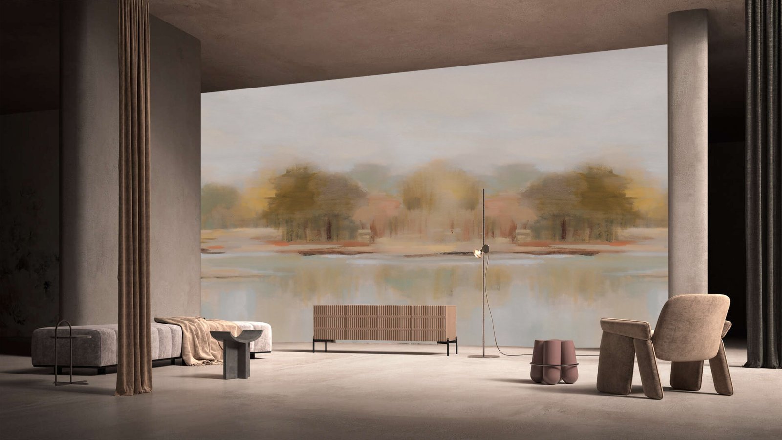 Inspired by painterly landscapes and quiet lakeside moments, this wallpaper brings a sense of balance and serenity into interior spaces. Subtle tones and mirrored forms create depth without distraction, offering a refined backdrop that feels both luxurious and soothing.