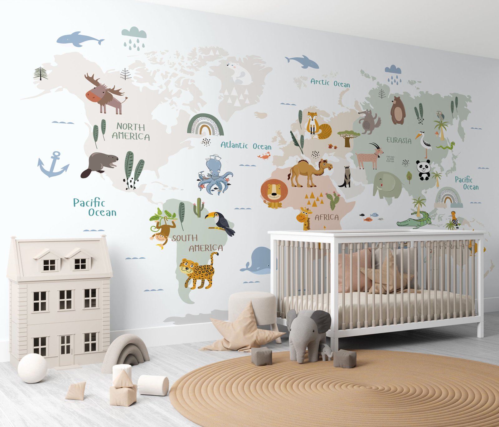 Safari World Map is a signature kids wallpaper designed to spark imagination and learning through playful global adventure. Made from high-durability materials, it’s built to withstand everyday use while remaining easy to clean and maintain. Featuring soft colors and adorable animal illustrations across the continents, Safari World Map brings warmth, wonder, and educational beauty to your child’s space—creating the perfect backdrop for both play and peaceful moments.
