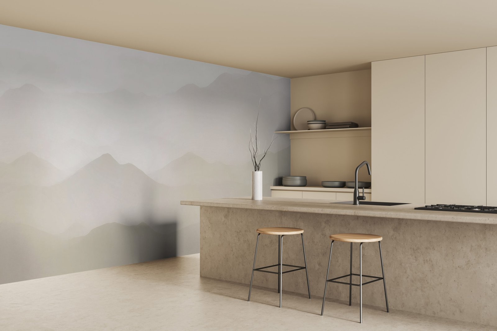 Silent Peaks tells a story of serenity and stillness — a gentle dance of mist rolling over endless mountains, captured in soft gradients and muted tones. This elegant wallpaper transforms any space into a calming sanctuary, where walls whisper of distant horizons and quiet moments.