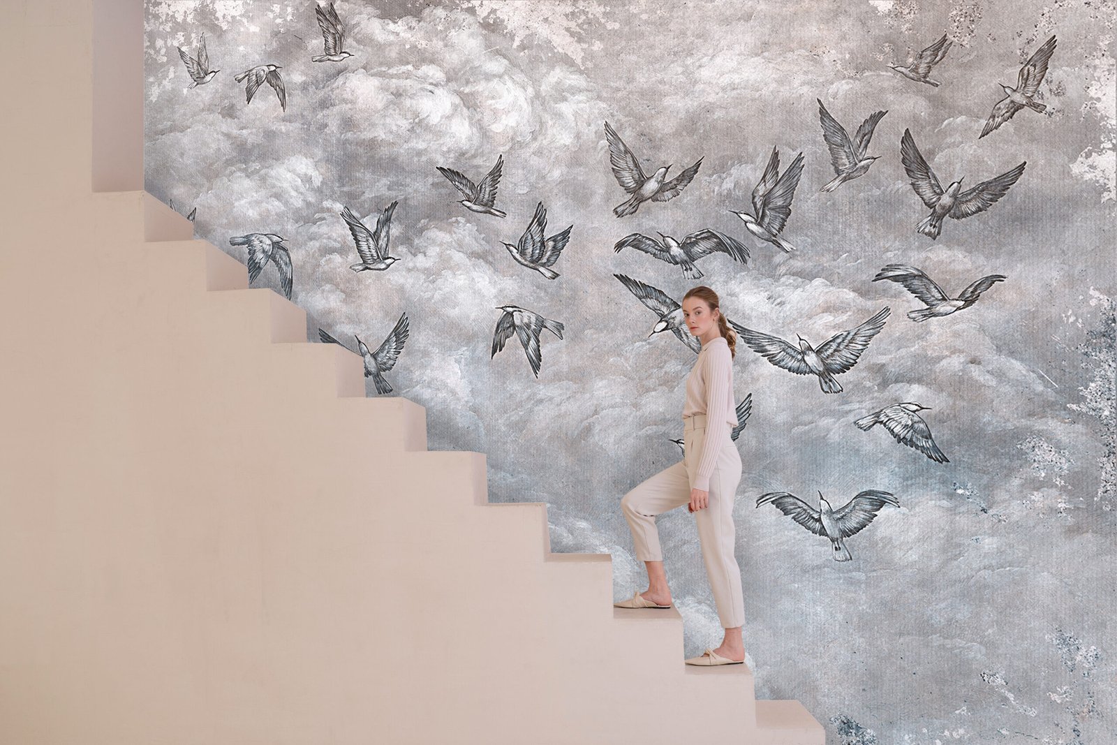 Graceful and weightless, Sky Ballet captures the poetic movement of birds in flight across a canvas of soft, hand-painted clouds. Each brushstroke tells a story of freedom and serenity, as if the walls themselves breathe with the rhythm of the open sky.