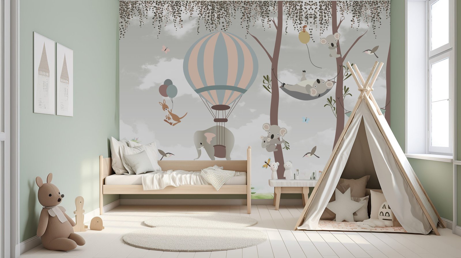 Sky Snuggles is a signature wallpaper that turns your child’s room into a dreamy adventure above the treetops. With cozy koalas, floating kangaroos, gentle elephants, and whimsical hot air balloons, this enchanting design inspires imagination and calm. Crafted from high-durability, premium materials, Sky Snuggles is built to last—perfect for withstanding the play and wonder of everyday life. Easy to clean and beautifully printed, it’s an ideal choice for nurseries, bedrooms, and play areas where comfort meets creativity.