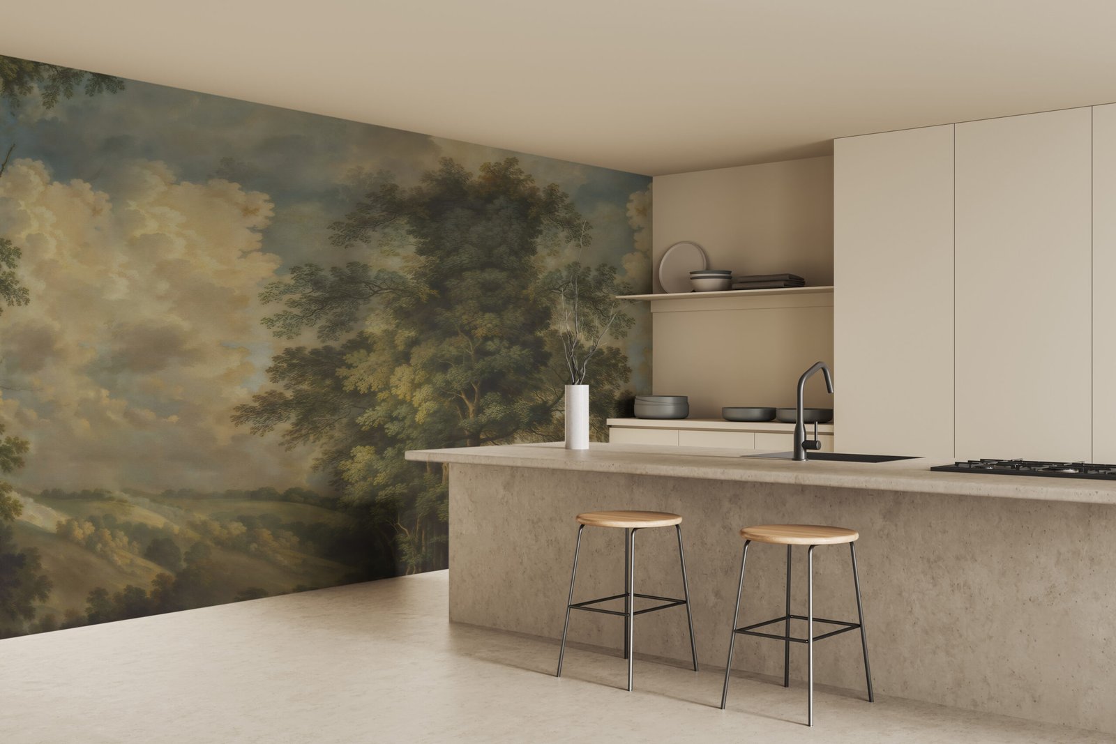 Step into a painted dream with Verdant Muse, a wallpaper that evokes the timeless beauty of classical landscapes. Inspired by the romantic charm of oil-painted countrysides, this design invites nature indoors with its lush trees, rolling hills, and soft, moody skies. Each detail feels like a brushstroke from an old master, offering a sense of calm and grandeur in equal measure.