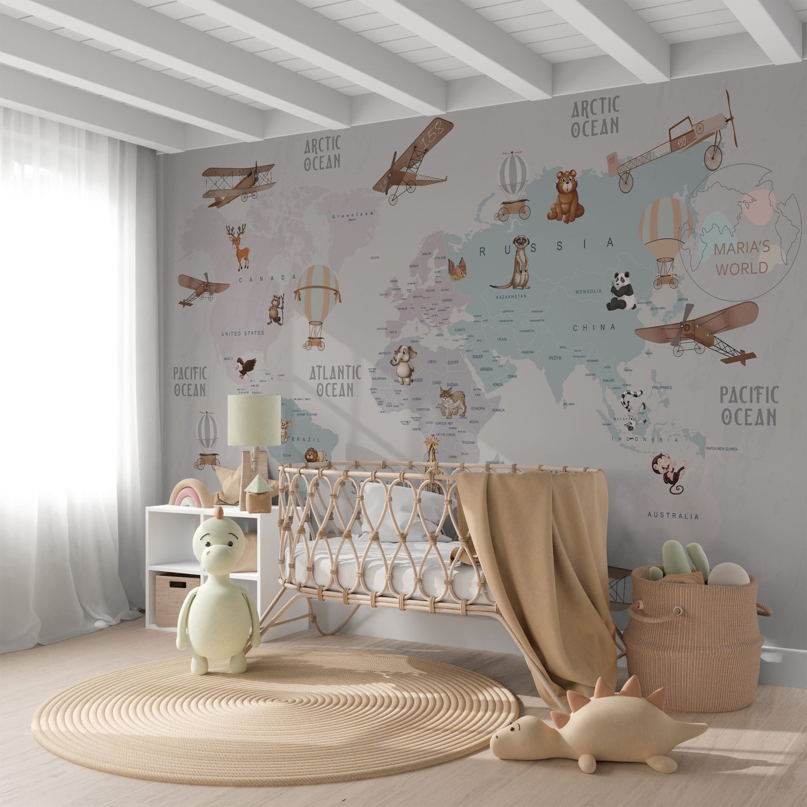 Whimsy Map is a signature kids wallpaper designed to turn your child’s space into a world of imagination, adventure, and charm. Crafted from high-durability materials, it’s made to withstand daily play while remaining easy to clean and maintain. With vintage airplanes, playful animals, and soft pastel tones, Whimsy Map brings both beauty and a sense of wonder to any room. As shown with the personalized name in the design, this wallpaper can be customized just for your little one—making their space feel truly unique and magical.