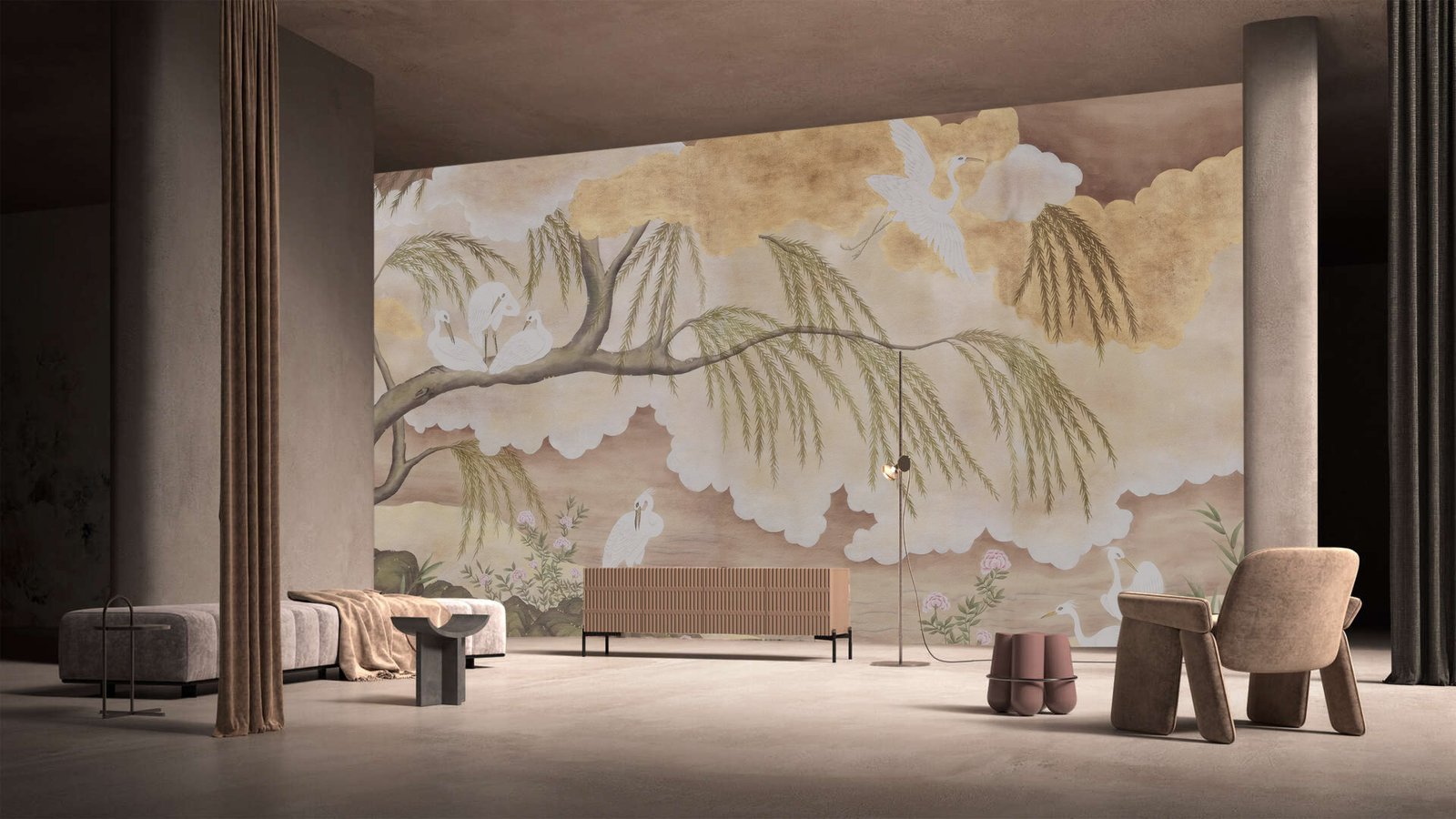 Inspired by classical mural art and the serenity of open horizons, this wallpaper creates a sense of depth and calm, transforming walls into a peaceful escape. Flowing branches and airy forms unfold delicately, inviting the eye to wander and the space to breathe.