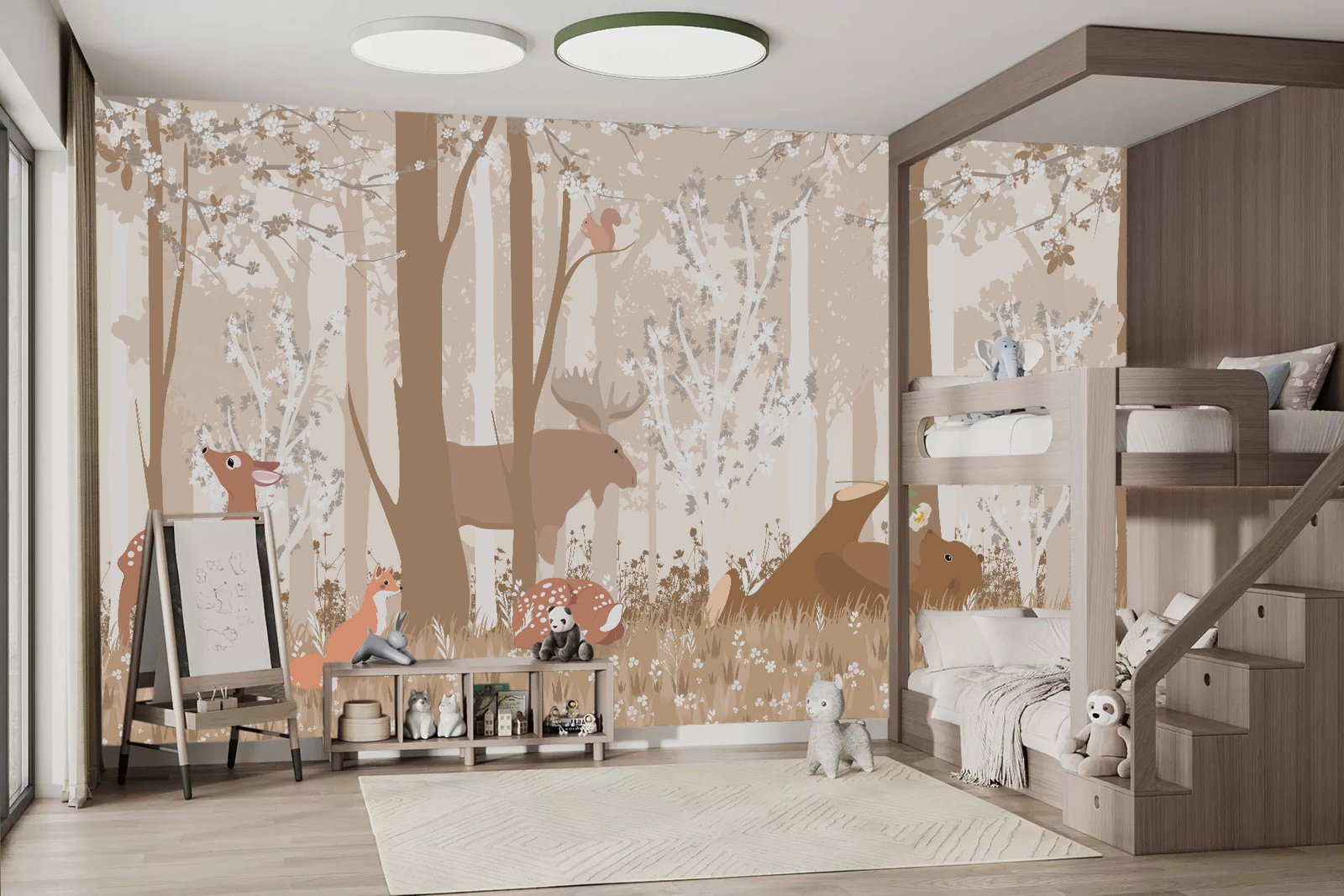 Woodland Wonders is a signature wallpaper that transforms any room into a peaceful forest retreat, where gentle deer, playful foxes, and sleepy bears rest beneath a soft woodland canopy. Designed with calming tones and charming details, it sparks imagination while offering a sense of serenity. Crafted from high-durability, child-safe materials, Woodland Wonders is easy to clean and built to last—making it an ideal choice for nurseries, playrooms, and cozy reading corners.